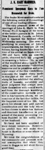 The following marriage announcement appeared in the Carbon County Journal dated February 20, 1909 pg. 1: “The very pleasant news of the marriage of John K. Hartt to Miss Minnev Pearl Sprague at the home of the bride’s parents in St. Johns, New Brunswick, Canada, on February 3, reached the Sentinel office Wednesday morning. The news is gratifying to every one of John’s acquaintances, for they are all his friends, having known him from the time of his arrival on Snake River in 1893 and have, with an unselfish pride, observed daily his progress in amassing a fortune.” (71)